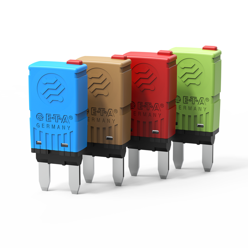 Current ratings correspond to those of blade fuses. Clear colour coding of the ratings: blade fuse and circuit breaker of the same colour have the same rating.