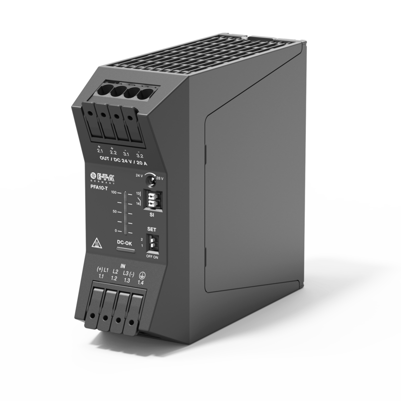 The primary pulsed PFA10-T switch mode power supply unit is ideal for automation and mechanical engineering applications. The compact design allows space-saving integration in control cabinets with limited installation space. The housing with 25° inclined connections enables tool-free installation and quick replacement.