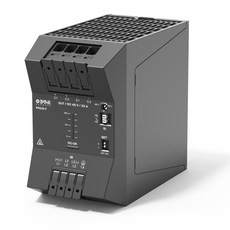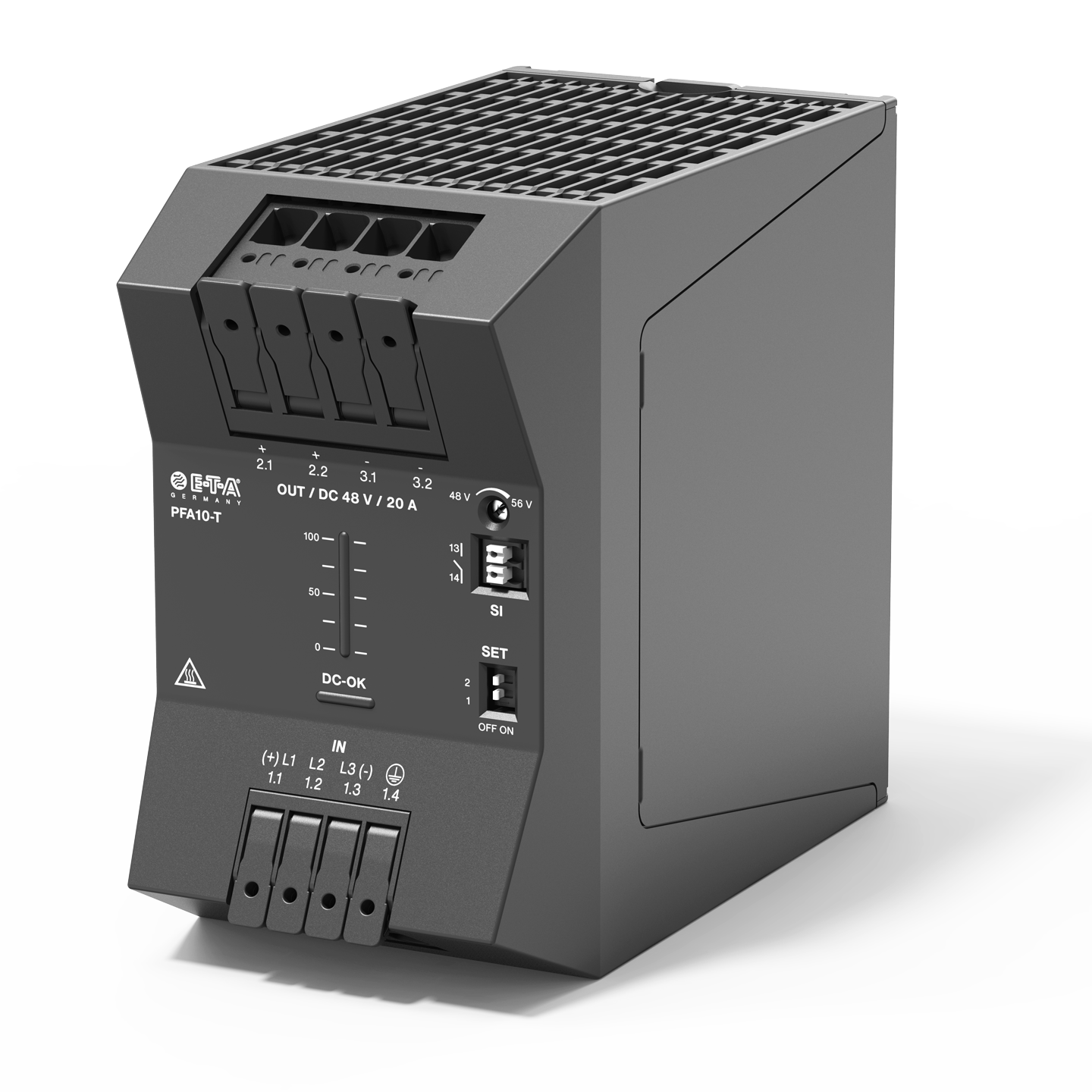 The primary pulsed PFA10-T switch mode power supply unit is ideal for automation and mechanical engineering applications. The compact design allows space-saving integration in control cabinets with limited installation space. The housing with 25° inclined connections enables tool-free installation and quick replacement.