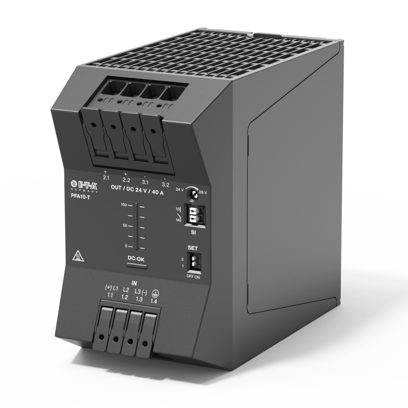 The primary pulsed PFA10-T switch mode power supply unit is ideal for automation and mechanical engineering applications. The compact design allows space-saving integration in control cabinets with limited installation space. The housing with 25° inclined connections enables tool-free installation and quick replacement.